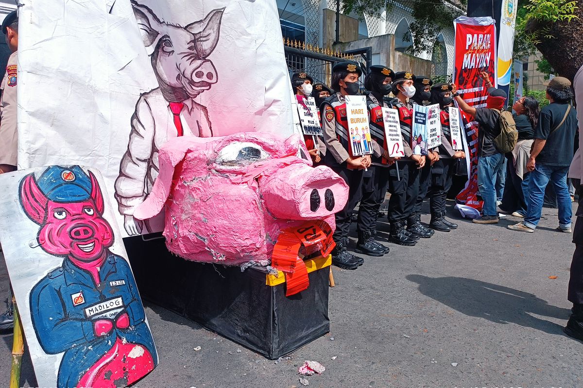 Mereka berorasi untuk menyampaikan berbagai keresahan, serta membawa sejumlah peralatan aksi, seperti spanduk dan patung kepala babi berukuran besar yang terbuat dari kardus.
