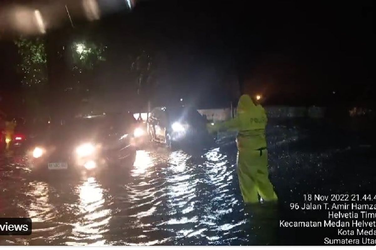 "Jalan Dr Mansyur mengarah ke pintu empat (USU), pintu empat mengarah ke pintu pintu satu tidak bisa di lalui karena genangan air cukup tinggi," kata anggota Bhabinkamtibmas Polsek Medan Baru Aiptu Robinson Simatupang, Robinson dalam video yang diunggah di akun Instagram Polsekmedan baru.