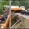 Tangki truk mengalami kerusakan sehingga minyak yang tumpah pun dipungut warga.